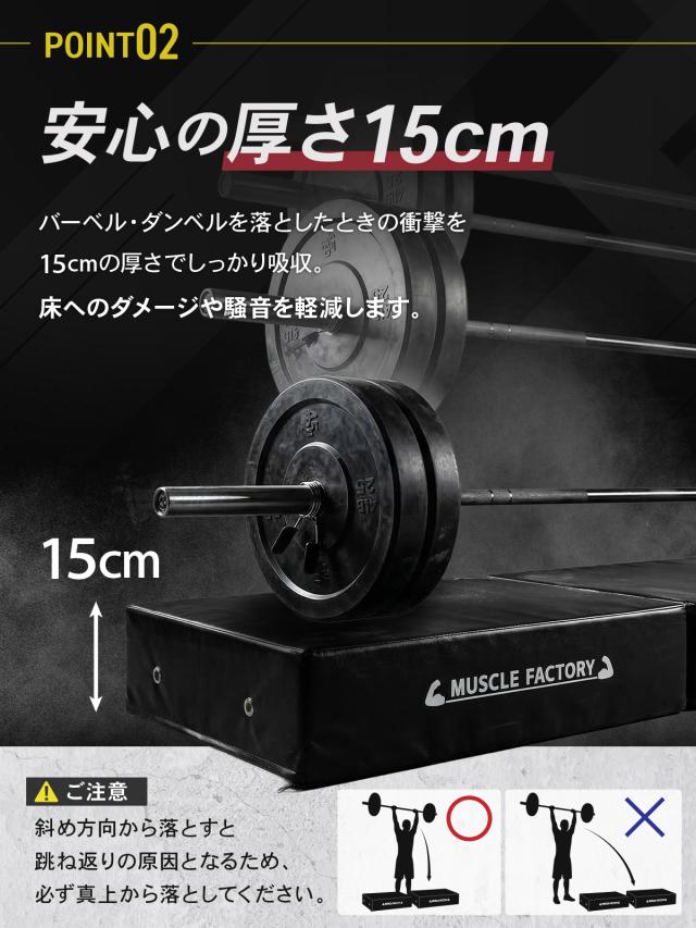 【厚さ15cmで安心の防音性能】15cmの極厚設計により、落下時の衝撃と騒音を大幅に軽減。自宅でも周囲を気にせずトレーニングでき、床へのダメージ対策にも効果的です。※跳ね返りの原因となるため、斜め方向からは落とさないでください。