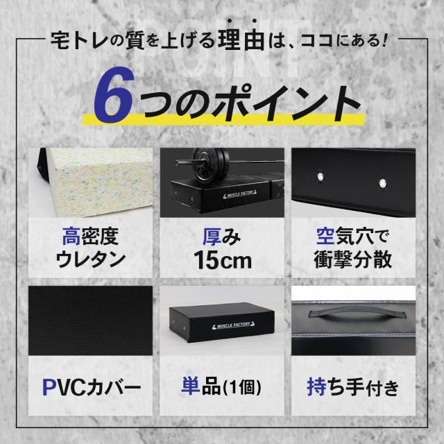 【厚さ15cmで安心の防音性能】15cmの極厚設計により、落下時の衝撃と騒音を大幅に軽減。自宅でも周囲を気にせずトレーニングでき、床へのダメージ対策にも効果的です。※跳ね返りの原因となるため、斜め方向からは落とさないでください。