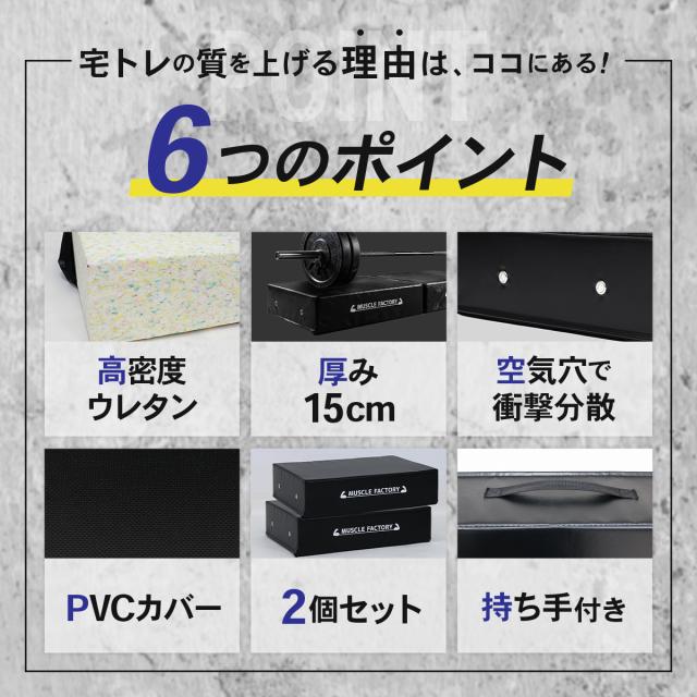 【厚さ15cmで安心の防音性能】15cmの極厚設計により、落下時の衝撃と騒音を大幅に軽減。自宅でも周囲を気にせずトレーニングでき、床へのダメージ対策にも効果的です。※跳ね返りの原因となるため、斜め方向からは落とさないでください。