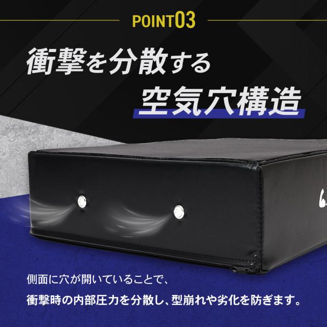 【衝撃を逃がす空気穴構造】側面の空気穴が内部の圧力を分散し、衝撃を効率よく吸収。型崩れや劣化を防ぎ、長期間安定した性能を維持します。さらに持ち手付きで持ち運び楽々。設置や移動もスムーズに行えます。