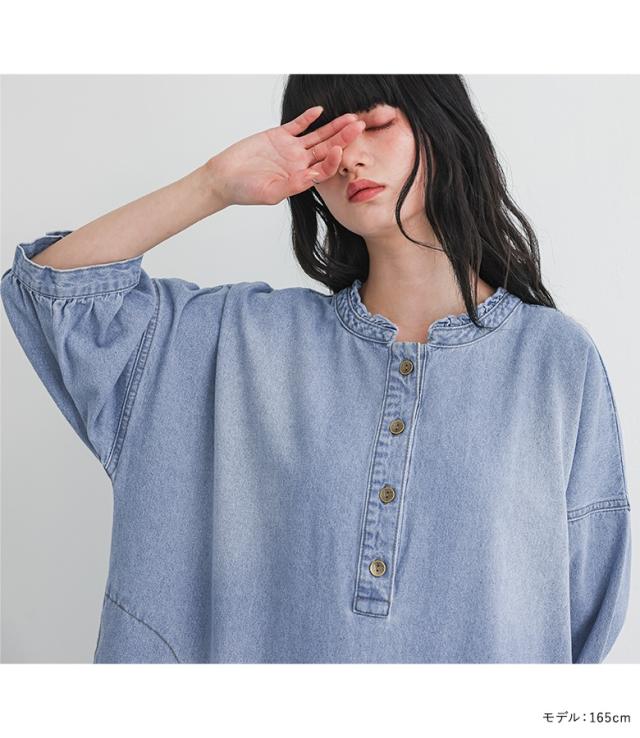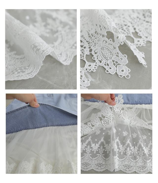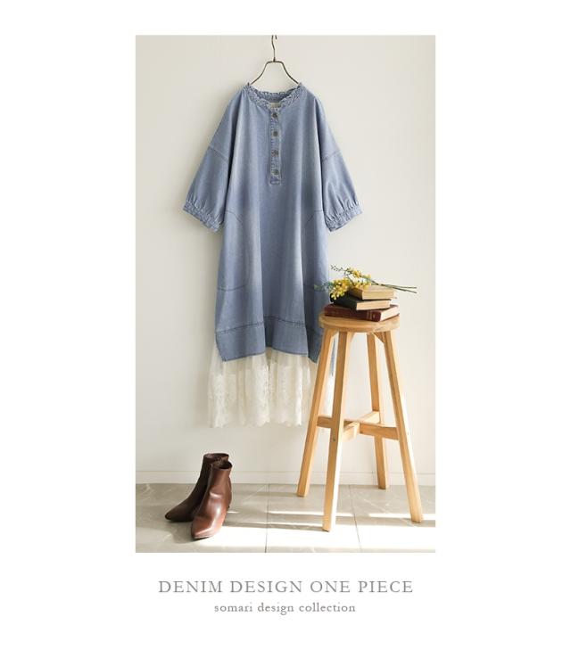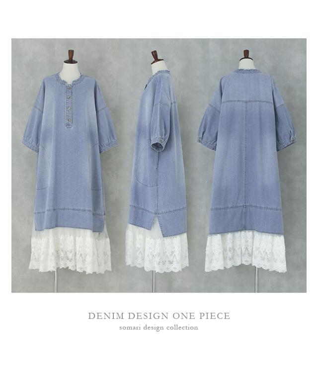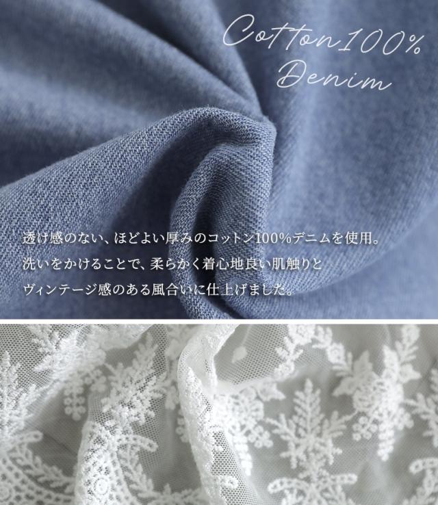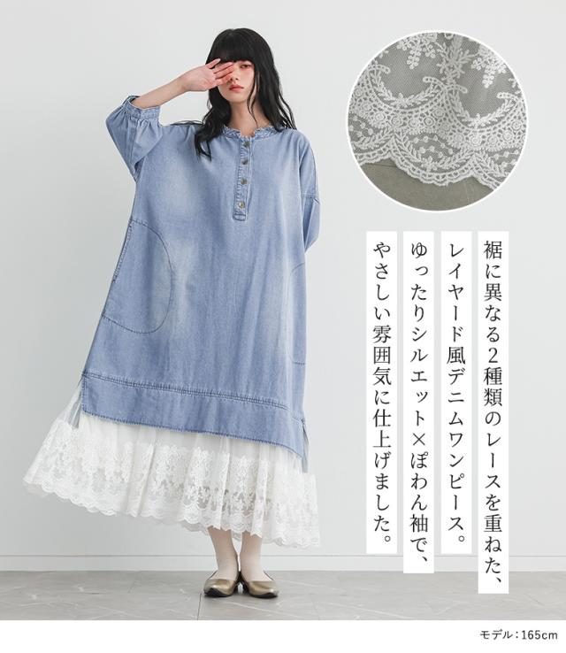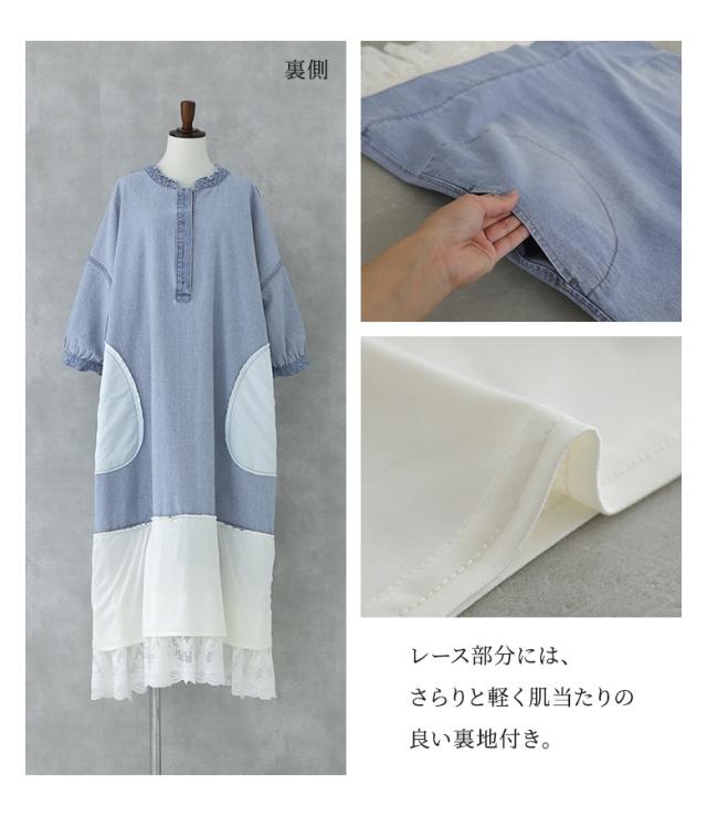 <春新作>『レースドッキングデニムワンピース』【メール便不可】【40】[デニム ワンピース 七分袖 レディース 春 夏 ドレス ロングワンピース チュールレース ケミカルレース 綿100% 異素材 ゆったり]