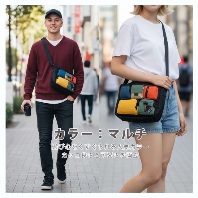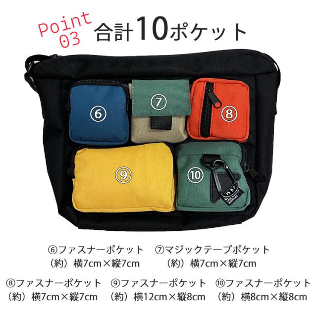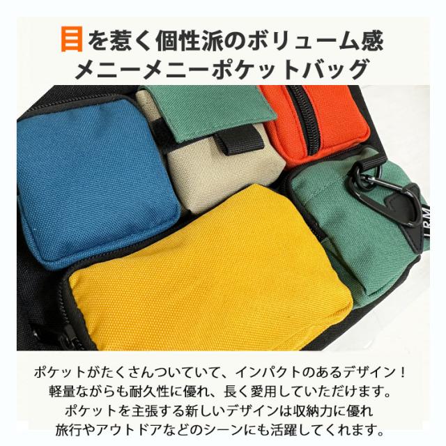 ・様々な形のポケットが並んだ、遊び心あるデザインのショルダーバッグ。