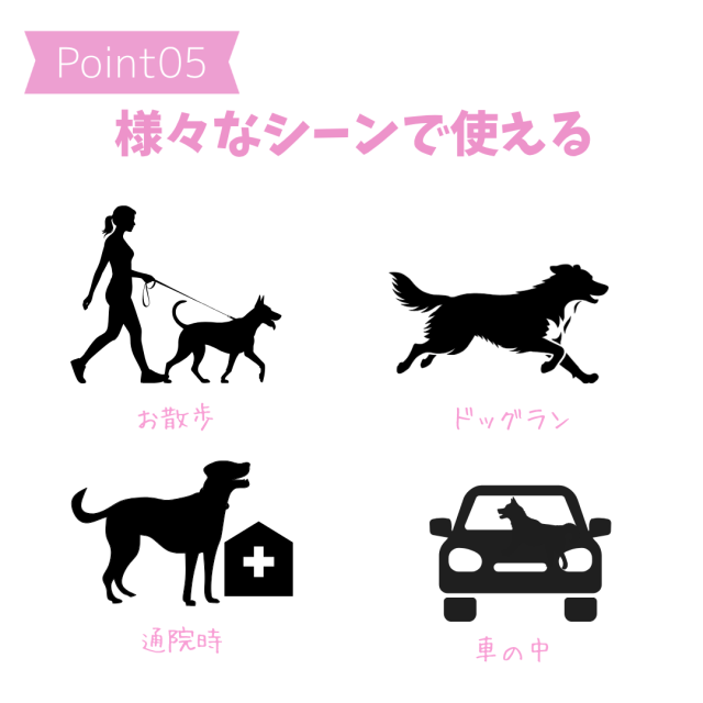 愛犬とのお散歩やドッグラン、旅行など様々なシーンで活躍します。
