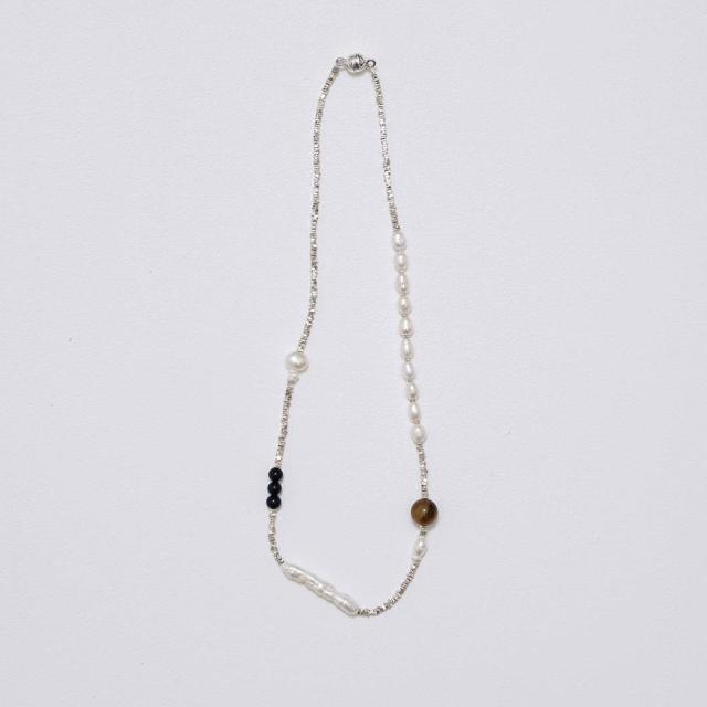 淡水パールとSilver925ビーズをベースに、オニキス・タイガーアイなど異なる質感をミックスさせたチョーカー。