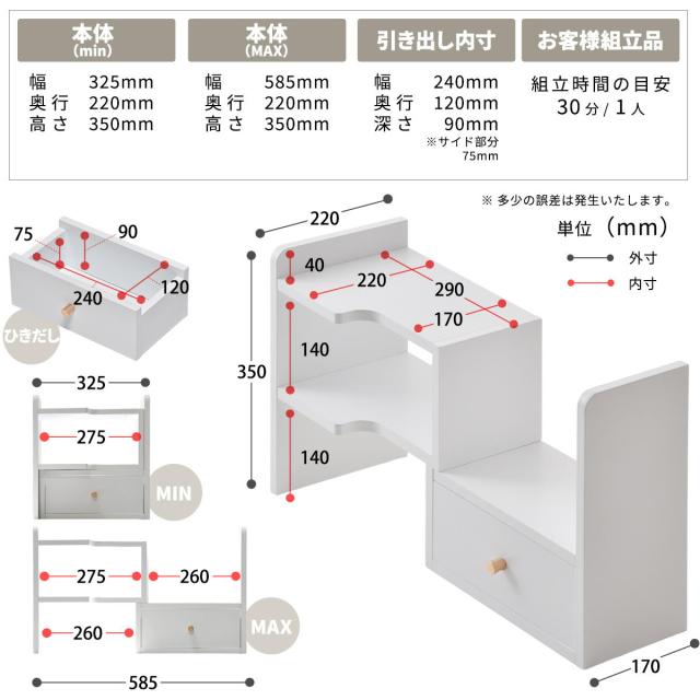 | 幅 325〜585 × 奥行 220 × 高さ 350 mm |