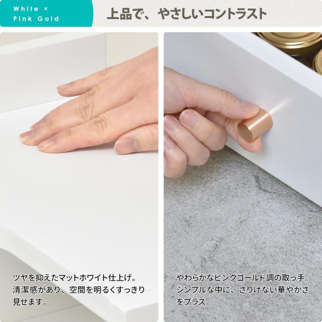 | 左右の棚を広げると、最大で約58cmまで伸ばせるBF DECOシリーズの卓上収納ラック。デスクやキッチンカウンター上などマルチに使えます。縮めてコンパクトに使うも良し、伸ばしてワイドに使うも良し、様々な場所で活躍♪角度をつければコーナーにも設置可能で、デッドスペースになる場所も有効に使えます。また、引き出しの取っ手がゴールドでワンポイントオシャレに! |