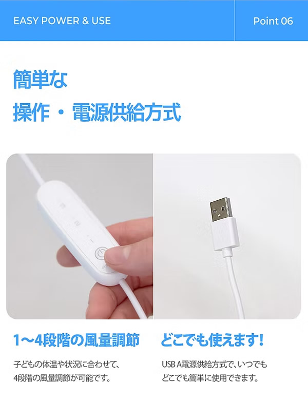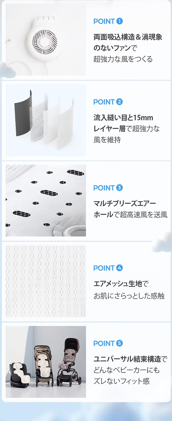 モバイルバッテリー式でベビーカー・チャイルドシートにぴったり。お出かけ先でも安心。