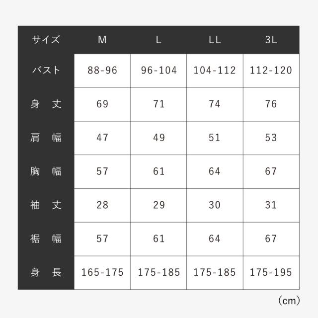 ■サイズ:M/身長165-175、胸囲88-96、身丈69、肩幅47、胸幅57、袖丈28、裾幅57、L/身長175-185、胸囲96-104、身丈71、肩幅49、胸幅61、袖丈29、裾幅61、LL/身長175-185、胸囲104-112、身丈74、肩幅51、胸幅64、袖丈30、裾幅64、3L/身長175-195、胸囲112-120、身丈76、肩幅53、胸幅67、袖丈31、裾幅67cm