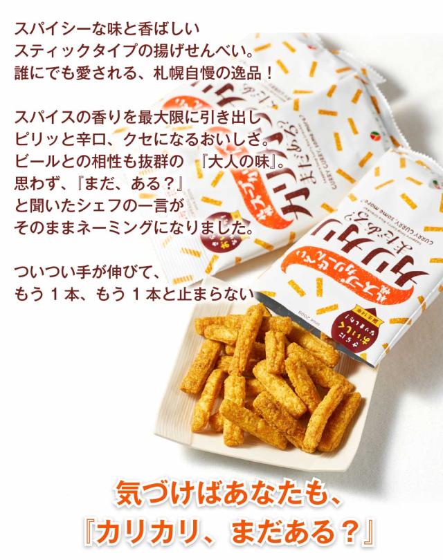 | 商品説明 | 誕生から14周年!スパイスのブレンドを見直して、さらに美味しくなりました。 スパイシーな味と香ばしいスティックタイプの揚げせんべい。誰にでも愛される、札幌自慢の逸品です! スパイスの香りを最大限に引き出しピリッと辛口、クセになるおいしさ。ビールとの相性も抜群の『大人の味』。 思わず、『まだ、ある?』と聞いたシェフの一言がそのままネーミングになりました。ついつい手が伸びて、もう1本、もう1本と止まらない 気づけばあなたも、『カリカリ、まだある?』 |