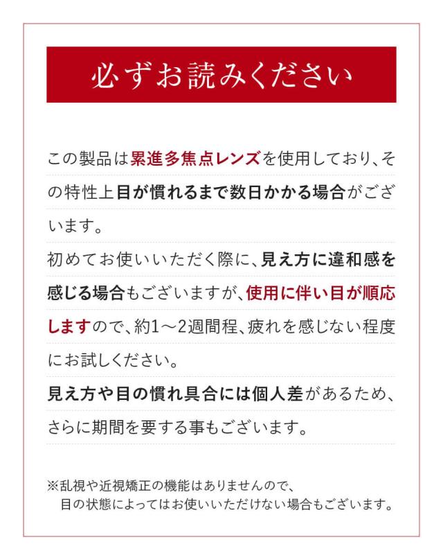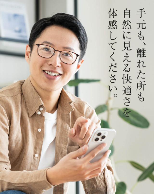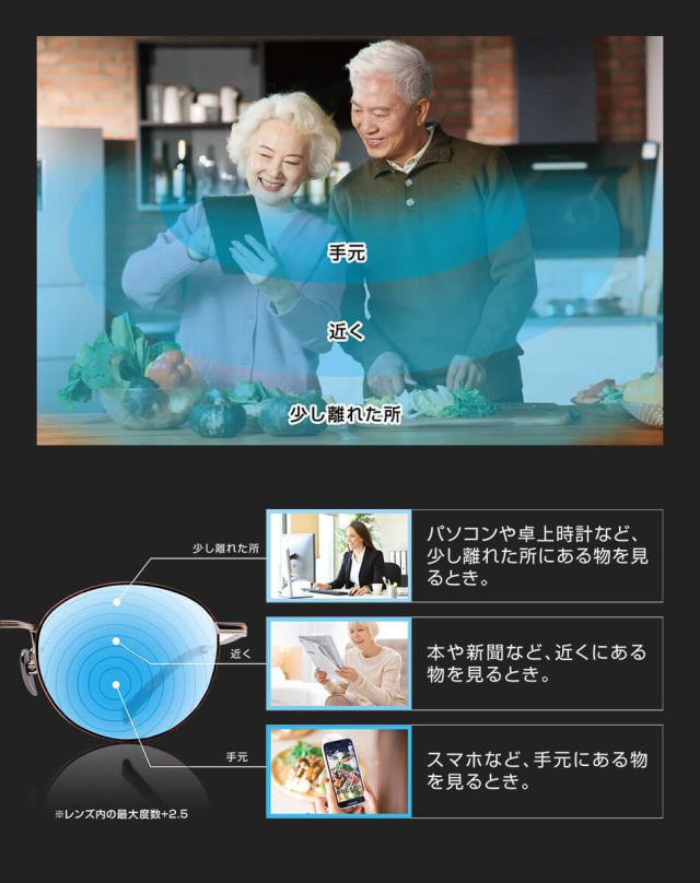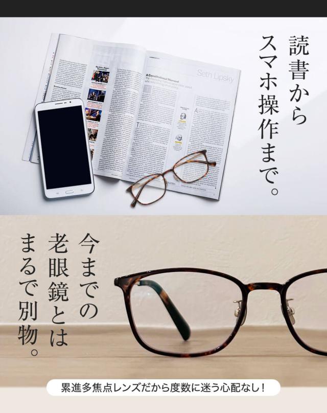 気がつけば外すのを忘れてしまうプレミアムな老眼鏡が誕生。累進多焦点レンズで掛けたままでも違和感のない視界を実現。