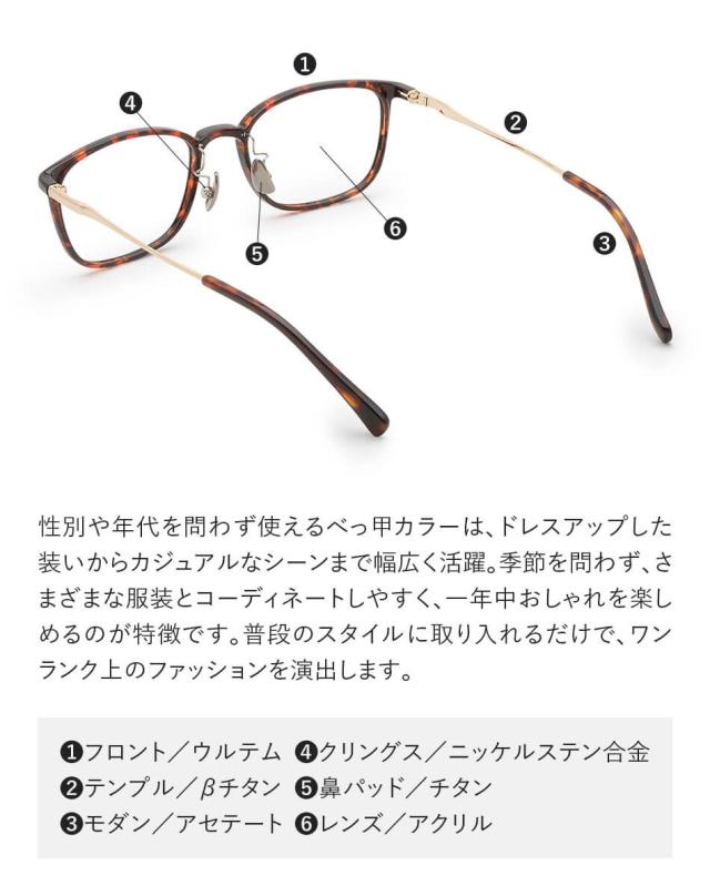 UW001-TO:(フロント)ウルテム、(テンプル)βチタン、(モダン)アセテート、(クリングス)ニッケルステン合金、(鼻パッド)チタン、(レンズ)アクリル