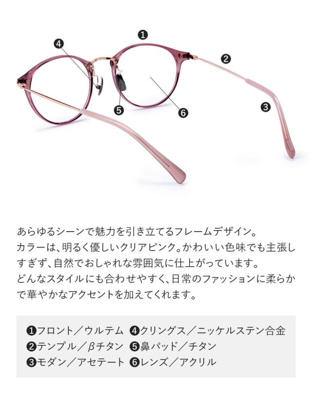 UB003-CPK:(フロント)ウルテム、(テンプル)βチタン、(モダン)アセテート、(クリングス)ニッケルステン合金、(鼻パッド)チタン、(レンズ)アクリル