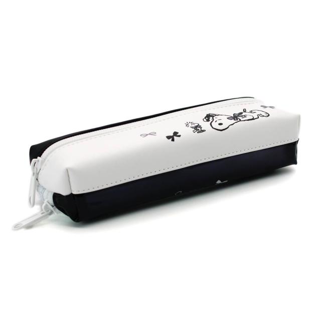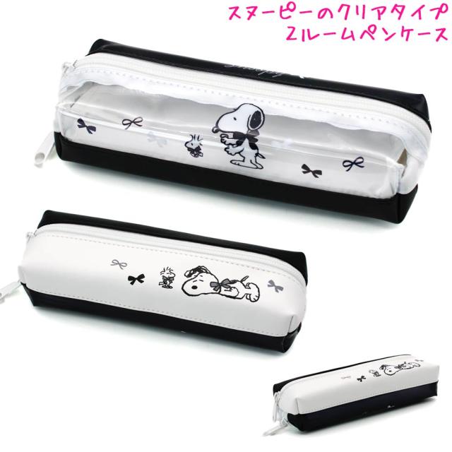 半面クリアデザインが魅力のスヌーピー2ルームスリムペンケースです。上部は中身が見やすいクリア素材、下部は落ち着いた印象の半面合皮で仕上げ、可愛さと大人っぽさを両立したデザインに仕上がっています。
