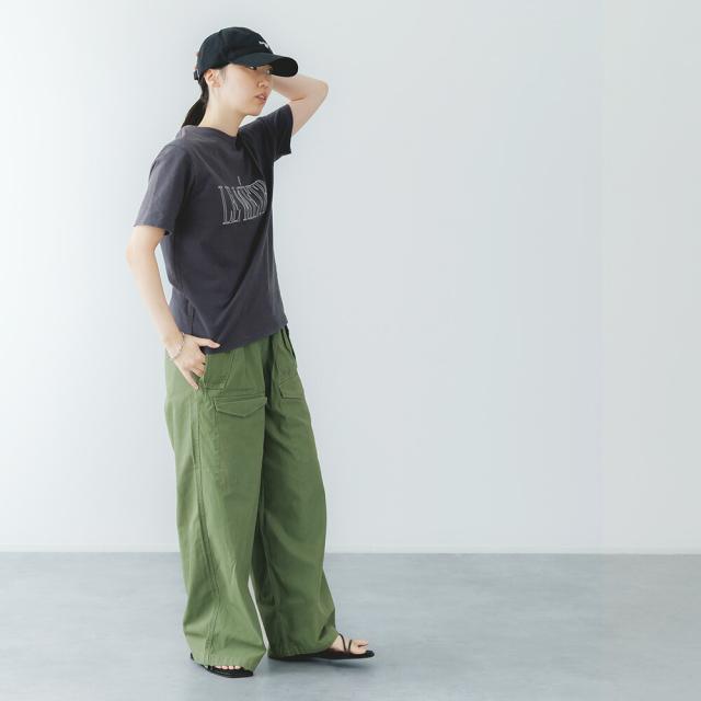 洗い加工コットンの柔らかな風合いと、控えめなロゴが絶妙なバランス。