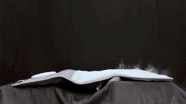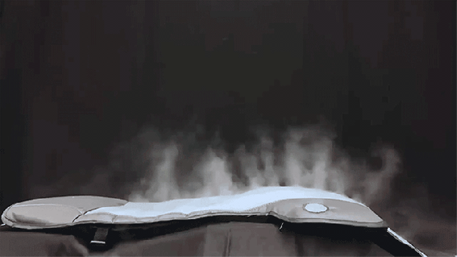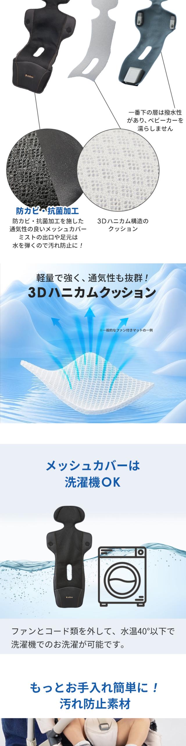 マットに内蔵された3つのファンからの風が3Dハニカムメッシュ構造を通じて全面に広がり、さらに両側から出るミストで冷感アップ!
