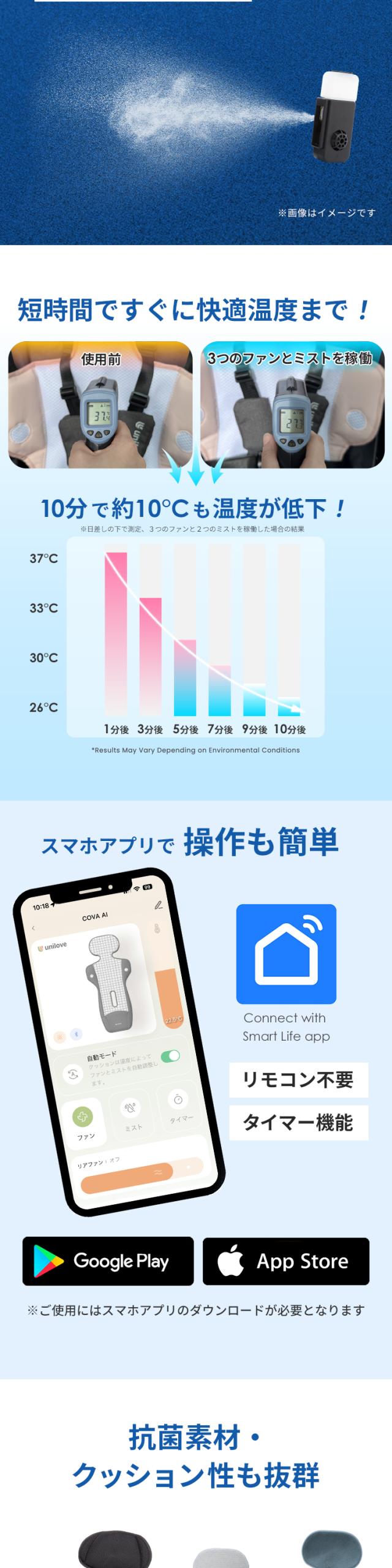 スマホで簡単に操作、外気温によってAIが送風レベルを自動調整してくれるので、冷えすぎの心配を軽減します。