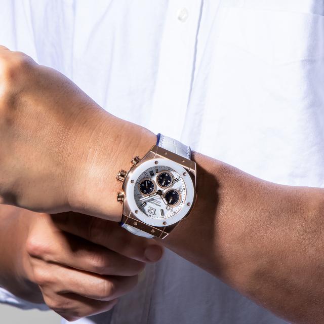 ラグジュアリーと遊び心を融合した「エクスベンチャー ソーラー」から、白を基調としたクリーンなカラーリングが、手元に洗練された印象をもたらすクロノグラフモデルが登場。セラミックベゼルのなめらかな質感と、ローズゴールドカラーのケースが美しく調和し、爽やかさの中に上質な存在感を感じさせます。