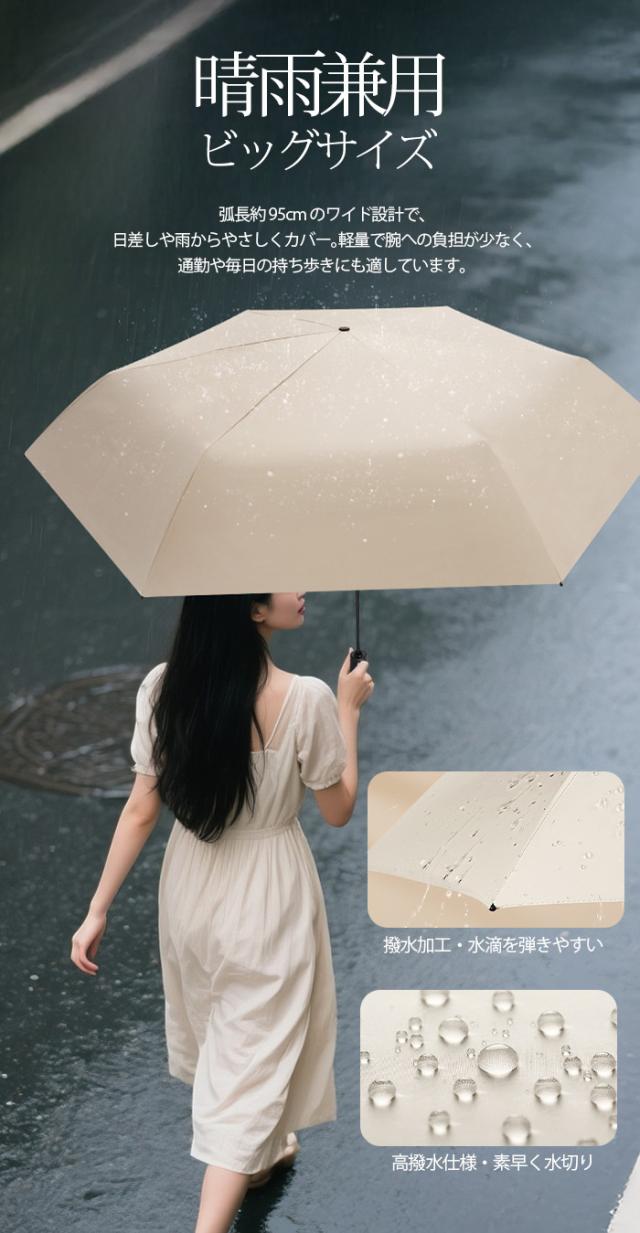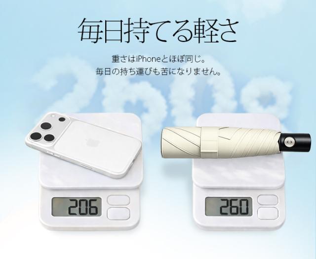 【晴雨兼用 コンパクト折りたたみ傘 自動開閉】 日傘・雨傘として使える晴雨兼用の折りたたみ傘です。 3段折りたたみ構造でコンパクトに収納でき、ワンタッチ自動開閉のジャンプ式仕様。 完全遮光仕様で紫外線対策に適しており、遮熱効果により暑い季節も快適に使用できます。 撥水加工を施しているため、日傘としてはもちろん、雨の日にも使える晴雨兼用傘です。 大判サイズ設計で日差しや雨をしっかりカバーし、 通勤・通学・お買い物・旅行・スポーツ観戦・アウトドアなど、幅広いシーンに対応。 6本骨構造で軽量ながら安定感があり、 無地でシンプルなデザインのため、レディース・メンズ兼用で使用できます。 【形状記憶タイプ(たたみやすい)】 折りたたみやすさを重視した 形状記憶生地タイプ です。 使用後も生地が自然に整いやすく、スムーズに折りたためるため、 閉じてからバッグにしまうまでの手間を軽減します。 折りたたみ後サイズは 約25×6cm、 重量は約260g と機能性を備えたバランス設計。 弧長 約100cm 直径90cm のサイズ感で、持ち歩きやすさを重視した仕様です。 カラーバリエーション:オフホワイト、ライトピンク、ライトパープル、ライトイエロー、ブラック。 |