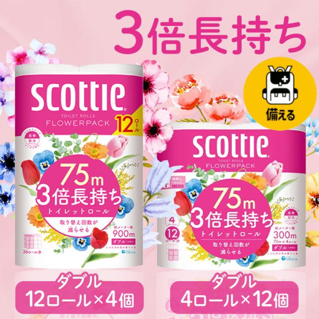 トイレットペーパー ダブル まとめ買い 3倍巻き スコッティ フラワーボックス 3倍巻 75m×4ロール 12個セット 75m×12ロール 4個セット くつろぎの花の香り 3倍長持ち クレシア ティッシュ 人気 まとめ買い ロング 送料無料