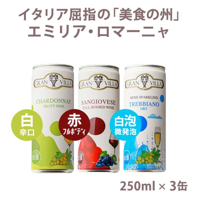 【 持ち運べる お手軽本格 金賞ワイン 】缶ワイン グランヴィラ 赤白泡 250ml 3缶セット 赤 白 泡 3本 ワインセット ワイン イタリア 辛口 赤ワイン 白ワイン スパークリングワイン セット