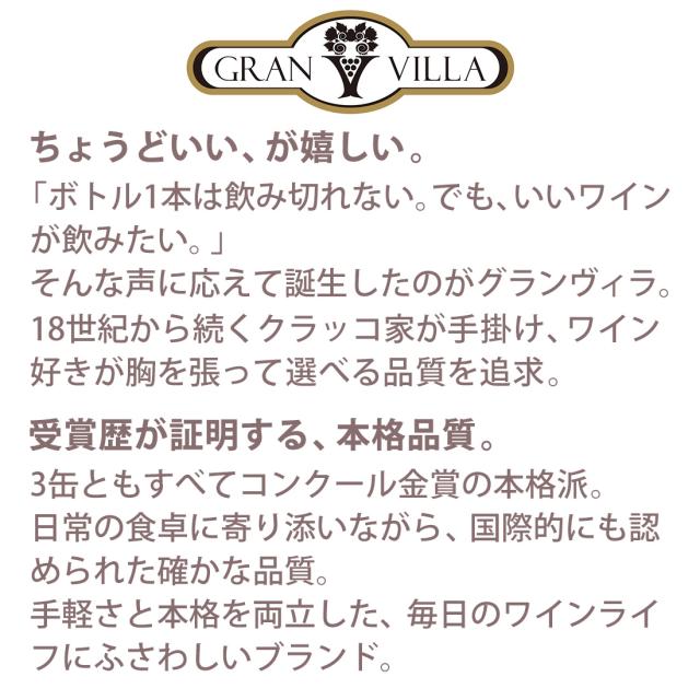 ちょうどいい、が嬉しい。グランヴィラが変える新しいワインの楽しみ方。【250ml×3缶】小さなサイズに本場の味わいを凝縮した、アウトドアにも最適な高品質な缶ワインです。