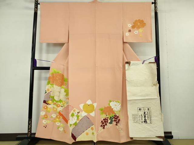平和屋本店●極上 銀座 志ま亀 訪問着 橘 牡丹 菊 赤香色地 金彩 たとう紙付き 逸品 DZAB5858kh6