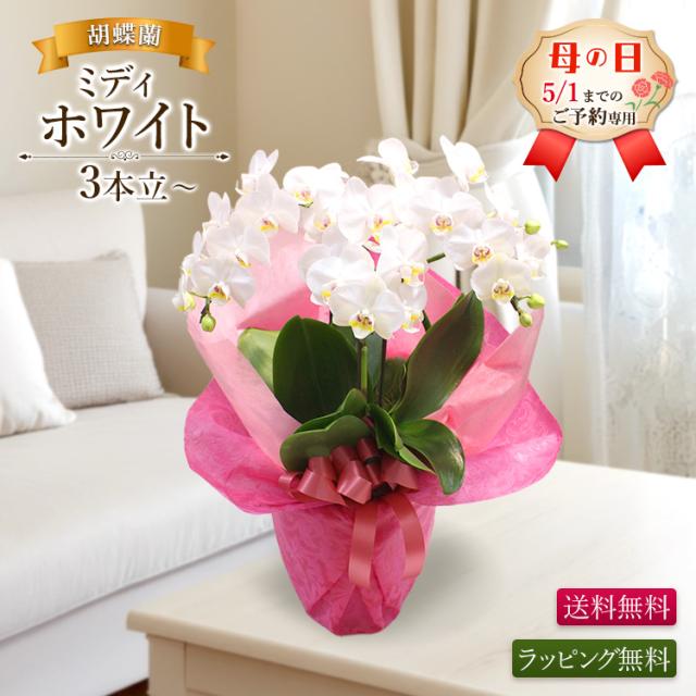 【2026年 母の日ギフト・5/1までのご予約専用/数量限定】胡蝶蘭 ミディホワイト 3本立以上 白 ホワイト 幸せが飛んで来る ラッピング無料 お祝い ギフト プレゼント 鉢植え [胡蝶蘭 ミディホワイト 母の日]