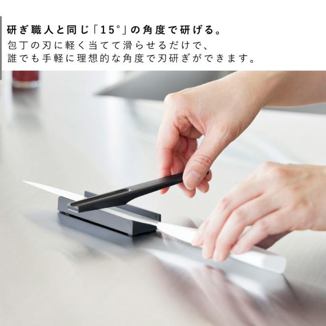 研ぎ職人と同じ「15°」の角度で研げる、スティック形状のシャープナー。包丁の刃に軽く当てて滑らせるだけで、誰でも手軽に理想的な角度で刃研ぎができ、切れ味を簡単にリフレッシュできます。