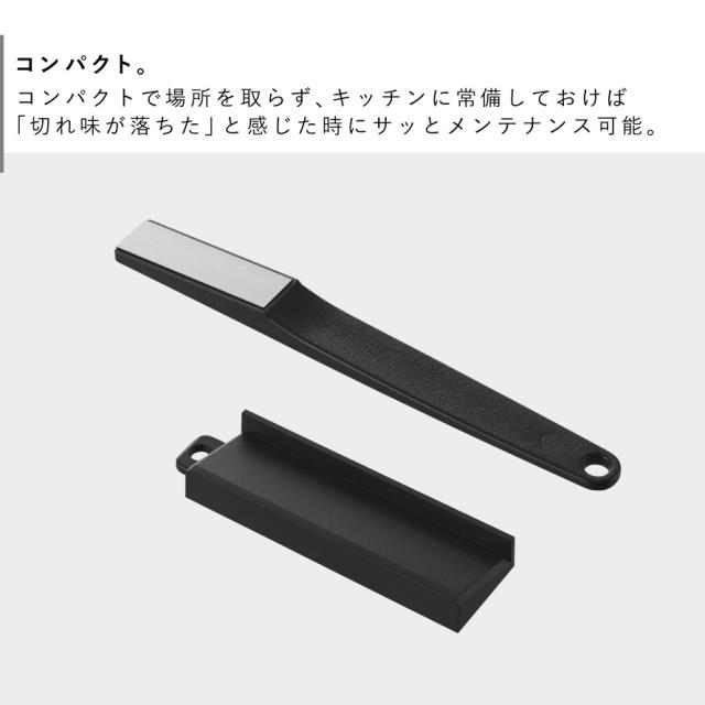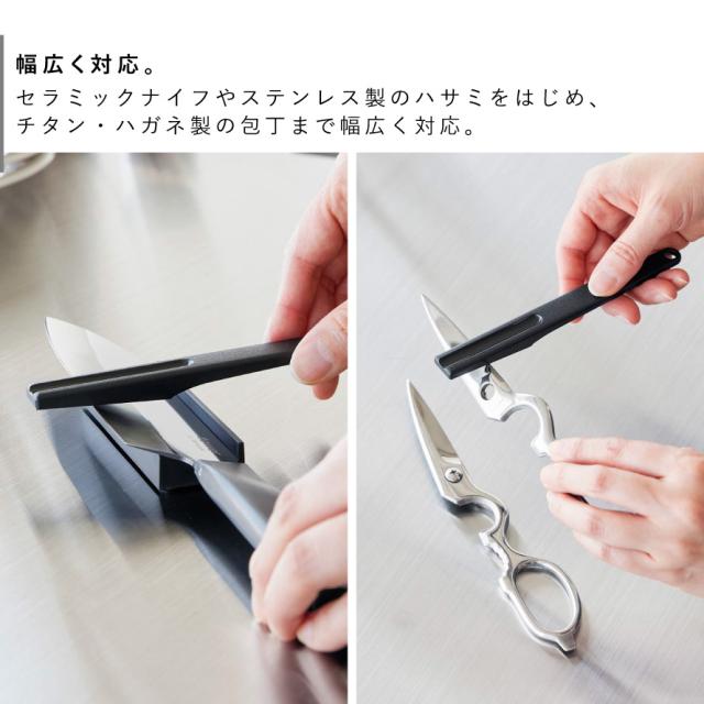 ステンレス製のハサミをはじめ、セラミック・チタン・ハガネ製の包丁まで幅広く対応。日常使いの包丁のメンテナンスはもちろん、釣り針など金属製品の仕上げにも使用できる便利な一本です。