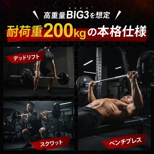 【耐荷重200kg!高重量BIG3に応える剛性】ベンチプレス・スクワット・デッドリフトの高重量トレーニングを想定した、耐荷重200kgの高剛性設計のバーベルシャフト。自宅でも本格的なBIG3環境を構築できます。※バーベルシャフトのみの販売ページとなります。
