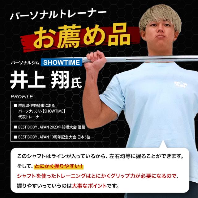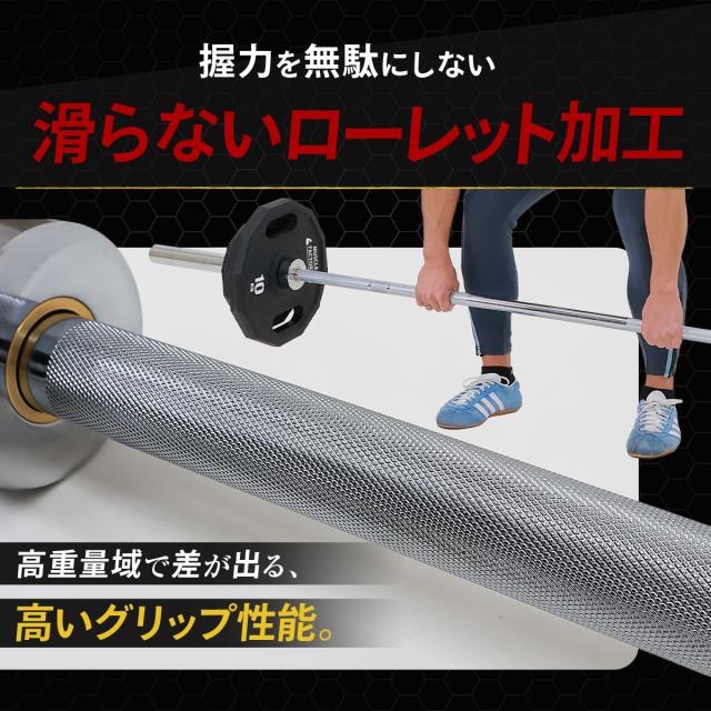 【高重量に適したオリンピック規格】シャフト径50mmのオリンピック規格を採用。剛性・安定性・プレート互換性に優れ、高重量トレーニングを前提とした設計のバーベルシャフトです。