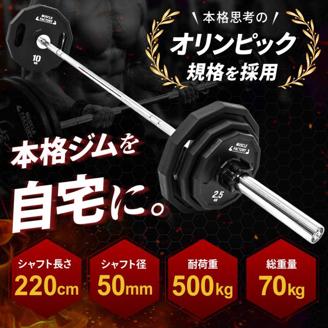 | 商品名 | オリンピックバーベル 初心者向けセット 最大70kg バーベル プレート ラバーコート 12角形プレート シャフト 220cm 直径50mm 耐荷重500kg BIG3 カラー付き トレーニング ベンチプレス デッドリフト ジム 自宅 筋トレ |
