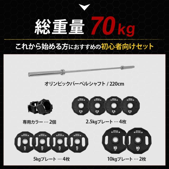 オリンピック規格を採用した総重量70kgの初心者向け本格バーベル入門セット!BIG3を軸にトレーニングしたい方に特におすすめの構成になっています。