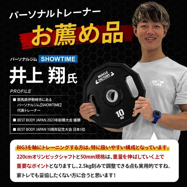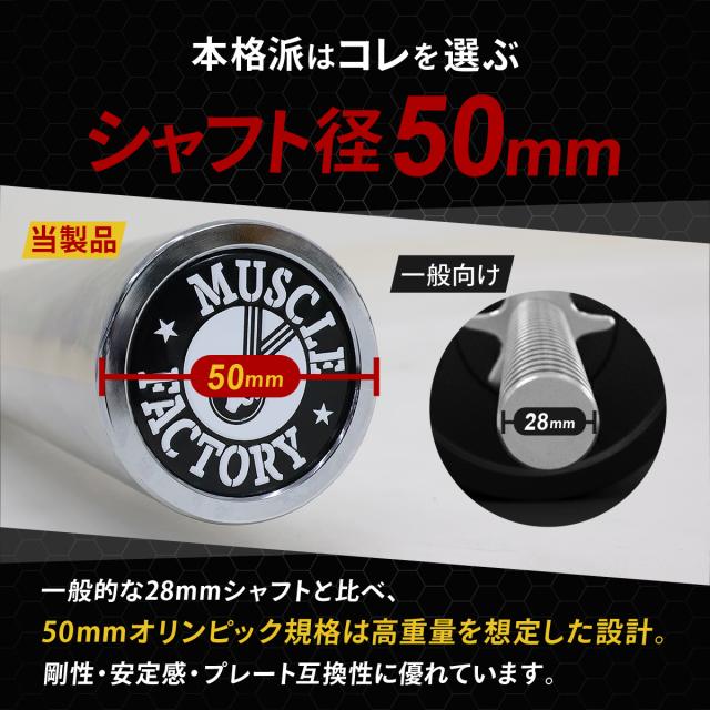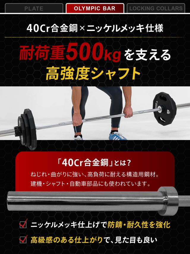 【BIG3を想定した本格仕様】50mmオリンピック規格シャフトを採用。耐荷重500kgの高剛性設計で、スクワット・ベンチ・デッドを軸にトレーニングしてる人に特に扱いやすい構成。パーソナルトレーナもおすすめの本気で鍛える人にふさわしいバーベルシャフトです。
