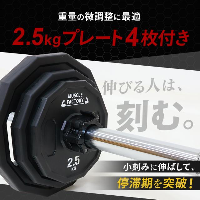【着実に伸ばせる構成のセット】2.5kgプレート・5kgプレートがメインの、これから筋トレを始めたい方やバーベル初心者におすすめのセットになっており、細かな重量調整が可能で段階的に記録を伸ばせます。