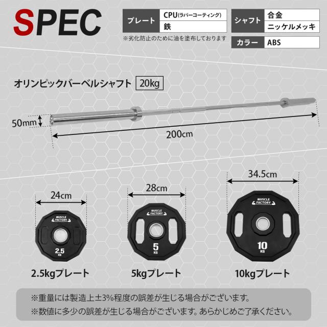 <オリンピックバーベルシャフト>直径50mm×220cm/重量20kg <2.5kgプレート>直径24cm <5kgプレート>直径28cm <10kgプレート>直径34.5cm ※重量には±3%程度の誤差が生じる場合がございます。 |