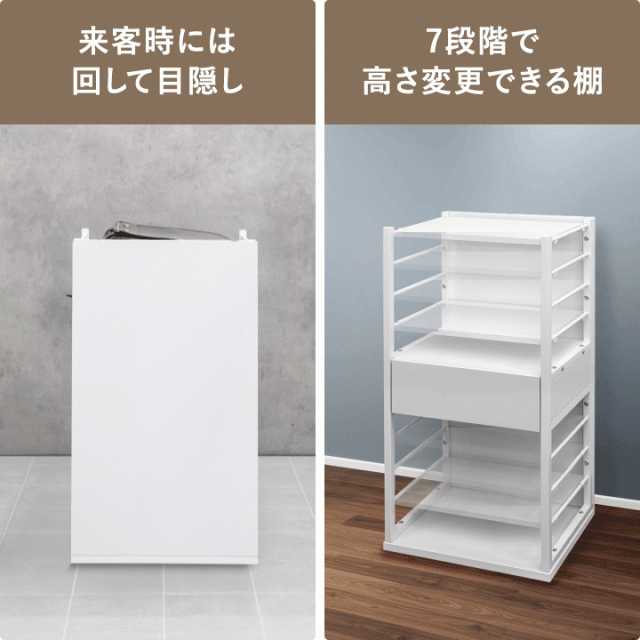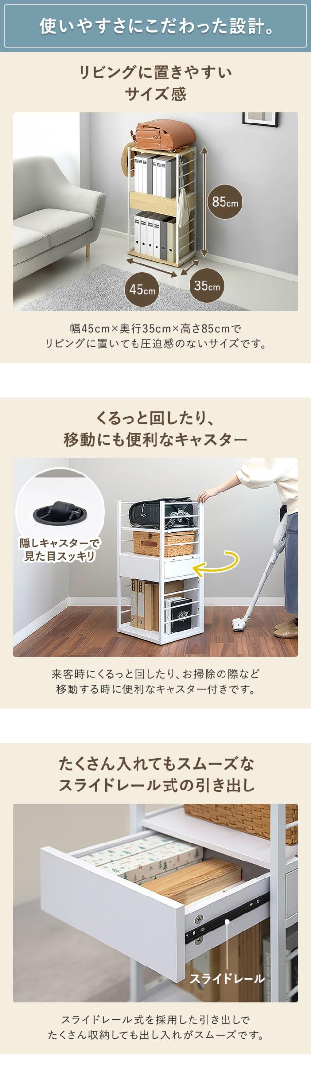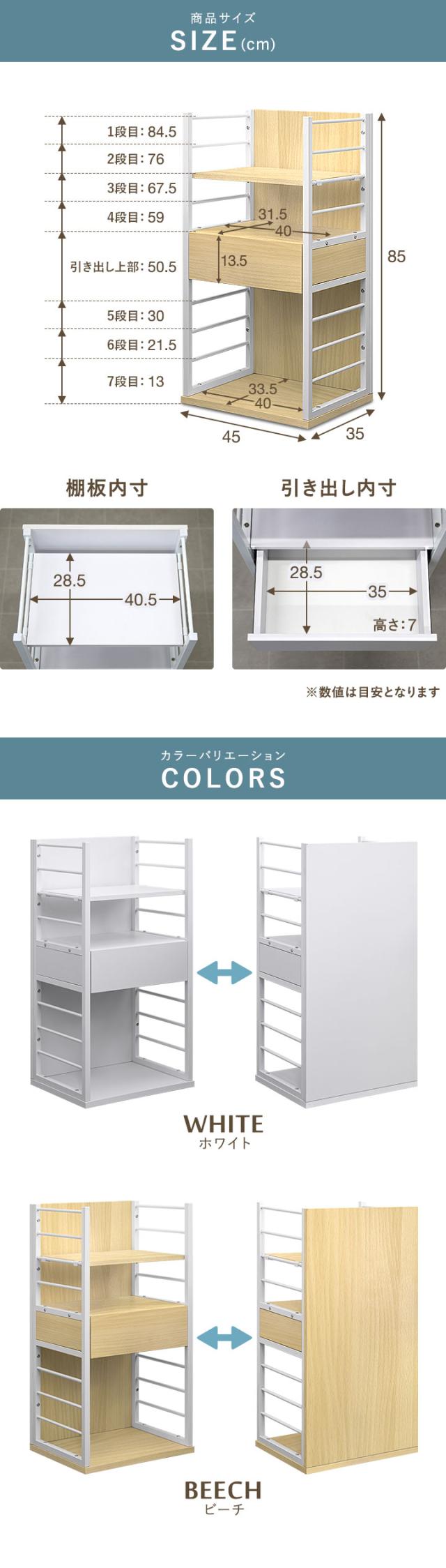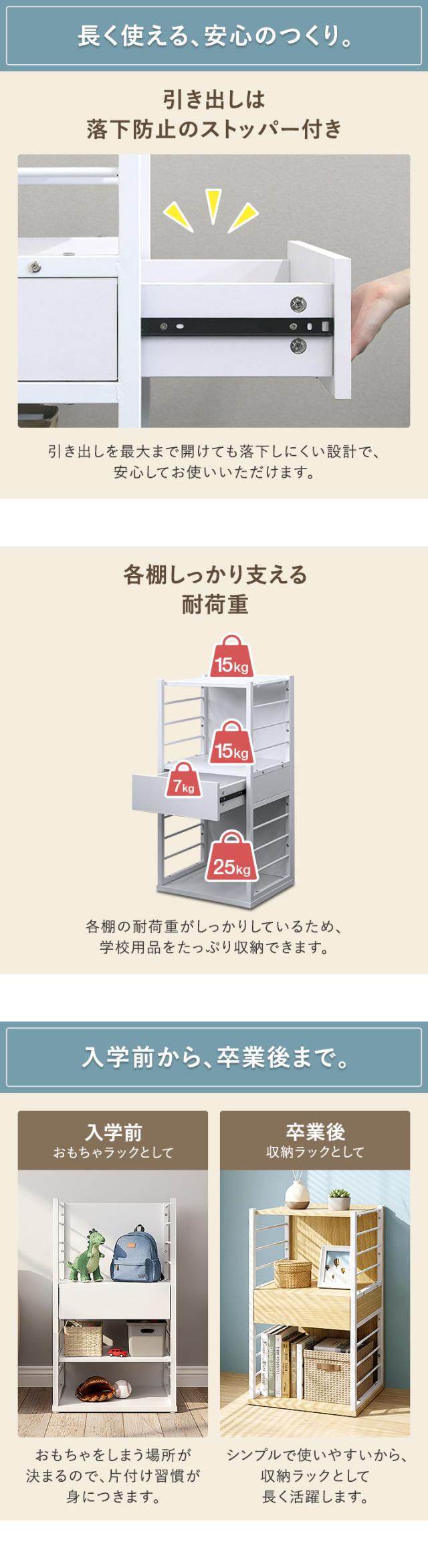 | 耐荷重: 可動棚:15kg 引き出し上部:15kg 引き出し内部:7kg 最下段:25kg |