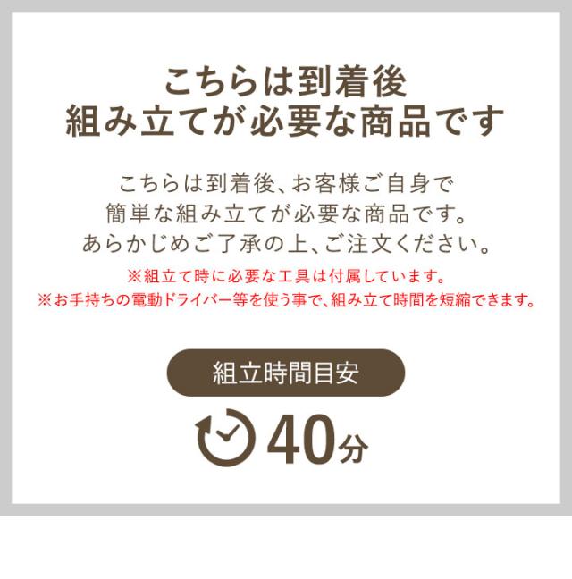 | 特記事項: ※こちらの商品はお客様組み立て品となります。(工具は付属しています) ※安全のため、組み立ては2人以上で行ってください。 ※耐荷重を超えてものを載せないでください。 ※組み立ての際は、電動ドライバーの使用を推奨します。お手持ちの電動ドライバーを使うことで、組み立て時間を短縮することができます。 |