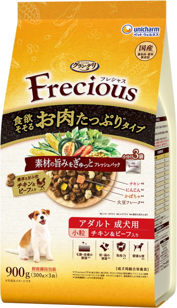 4520699170625素材の旨みをぎゅっとフレッシュパックした国産プレミアムドッグフードです。食欲そそるお肉たっぷり設計※(チキンとビーフの濃厚な旨み粒、フリーズドライのチキンをトッピング)。ドライ粒とフリーズドライ・エアドライの素材を、酸化を防ぐ鮮度維持包装をすることで、いつでも美味しくワンちゃんが喜びます。愛犬が大好きなチキン&ビーフ入り。小粒設計。※グランデリ フレシャス アダルト成犬用比約120%