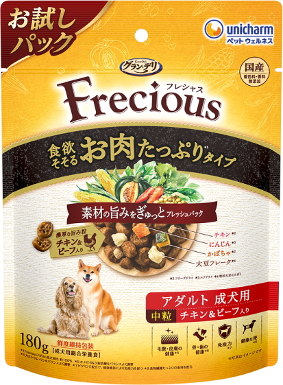 素材の旨みをぎゅっとフレッシュパックした国産プレミアムドッグフードです。食欲そそるお肉たっぷり設計※(チキンとビーフの濃厚な旨み粒、フリーズドライのチキンをトッピング)。ドライ粒とフリーズドライ・エアドライの素材を、酸化を防ぐ鮮度維持包装をすることで、いつでも美味しくワンちゃんが喜びます。愛犬が大好きなチキン&ビーフ入り。中粒設計。※グランデリ フレシャス アダルト成犬用比約120%