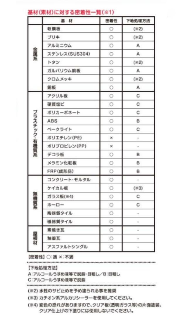 | 注意事項 | ※塗装する基材(素地)が金属や、プラスチックの場合【基材(素地)に対する密着性一覧※1】を参照して、アルコールうすめ液等で脱脂、または目粗しをしてください。 |