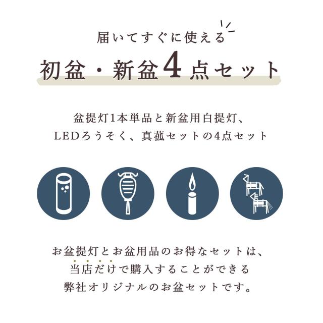 ・こちらの商品は、お盆提灯1本と初盆/新盆用白提灯、真菰セット、LEDローソクを合わせた、4点セットでの販売となります。