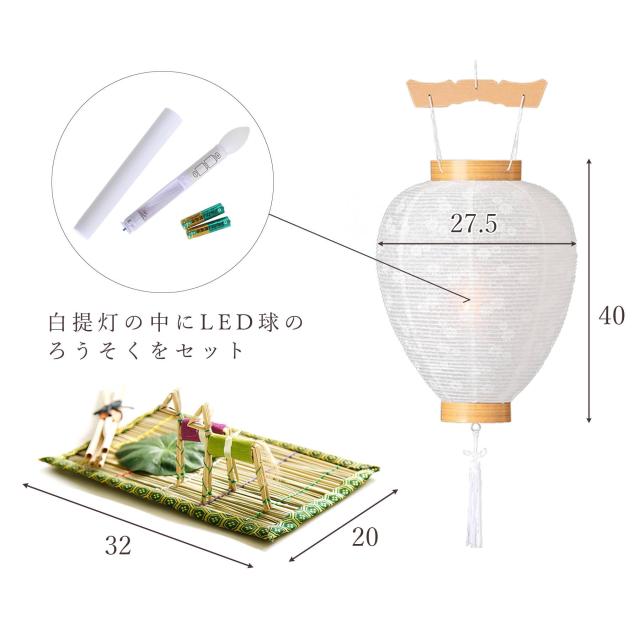 初盆・新盆の方にもおすすめな、お盆提灯と新盆用白提灯、LEDローソク、真菰セットの4点セットとなります。