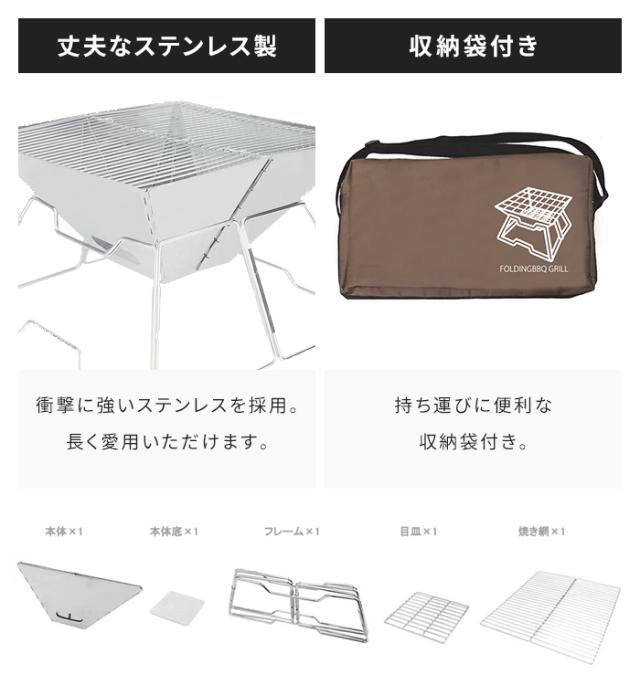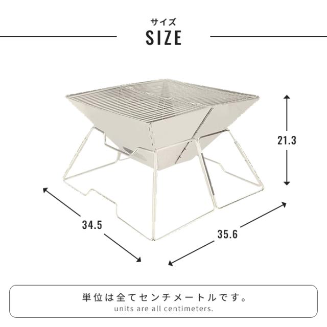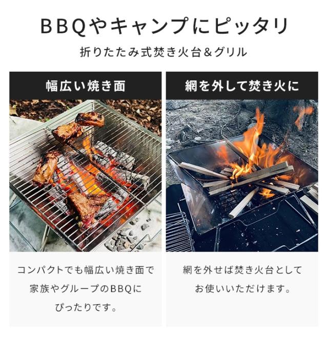 | ・コンパクトでも広々使える焼き面 ・焼き網を外して焚き火台としても使用可能 ・炭・薪どちらにも対応 ・組み立て簡単な折りたたみ式 ・収納袋付きで持ち運び便利 ・ステンレス製でサビに強く耐久性◎ |