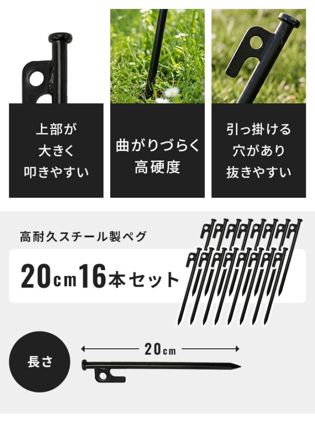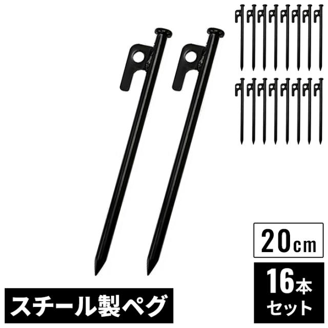 スチールペグ 20cm 16本 セット ブラック φ9mm スチール製 高強度 引き抜き穴付き ペグ テントペグ 鉄製 テント タープ 設営 固定用 頑丈 スチール 強力 固定用ペグ アウトドア キャンプ BBQ ペグセット 防災 黒