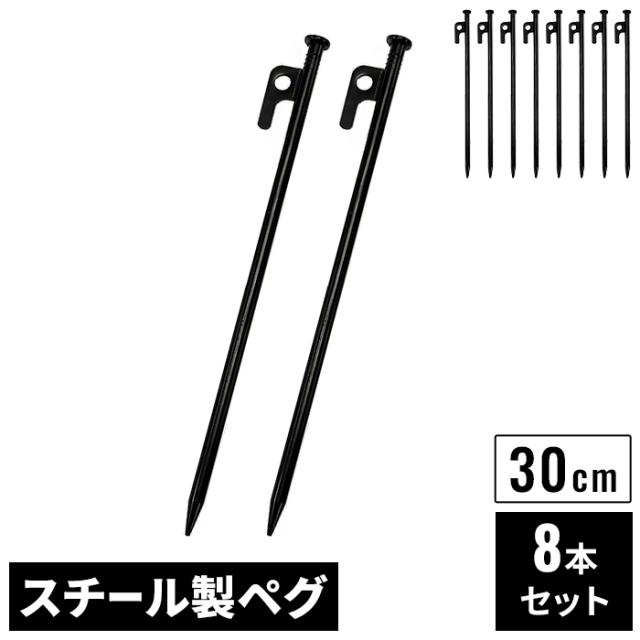 スチールペグ 30cm 8本 セット ブラック φ9mm スチール製 高強度 引き抜き穴付き ペグ テントペグ 鉄製 テント タープ 設営 固定用 頑丈 スチール 強力 固定用ペグ アウトドア キャンプ BBQ ペグセット 防災 黒