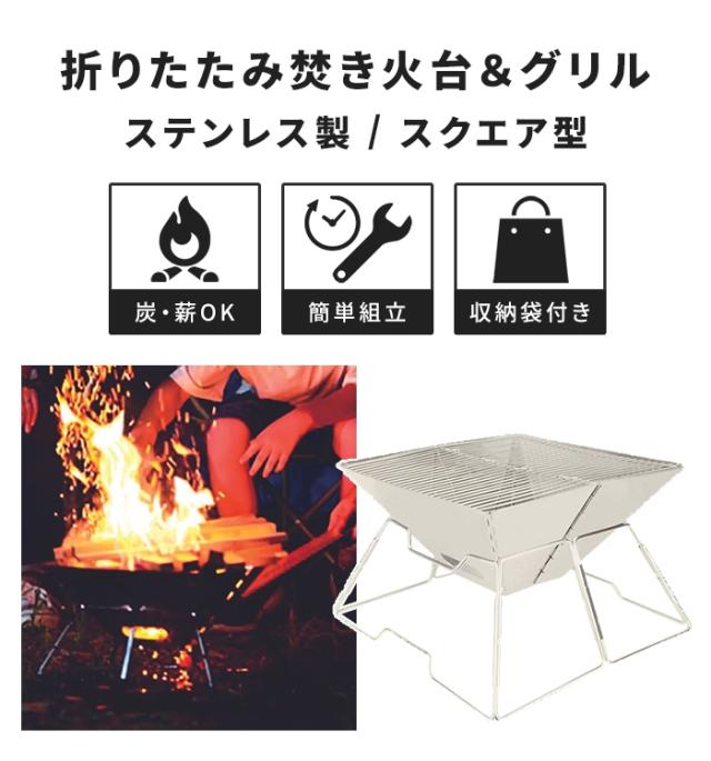 | 【ステンレス折りたたみ焚き火台】 ● ポータブル焚き火台&グリル ● 焚き火台&グリル スクエア ※このページは[ステンレス折りたたみ焚き火台 焚き火台&グリル スクエア]を販売しております。 |