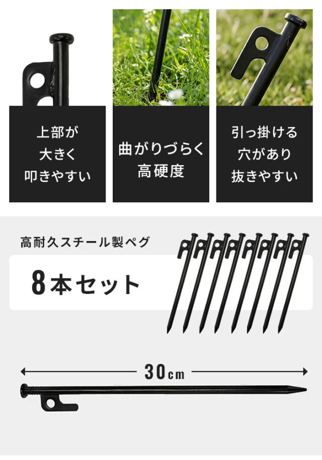 ペグは強度に優れたスチール製で、硬い地面でもしっかり打ち込める頑丈設計。円錐型の先端でスムーズに打ち込みができ、安定した固定力を発揮します。