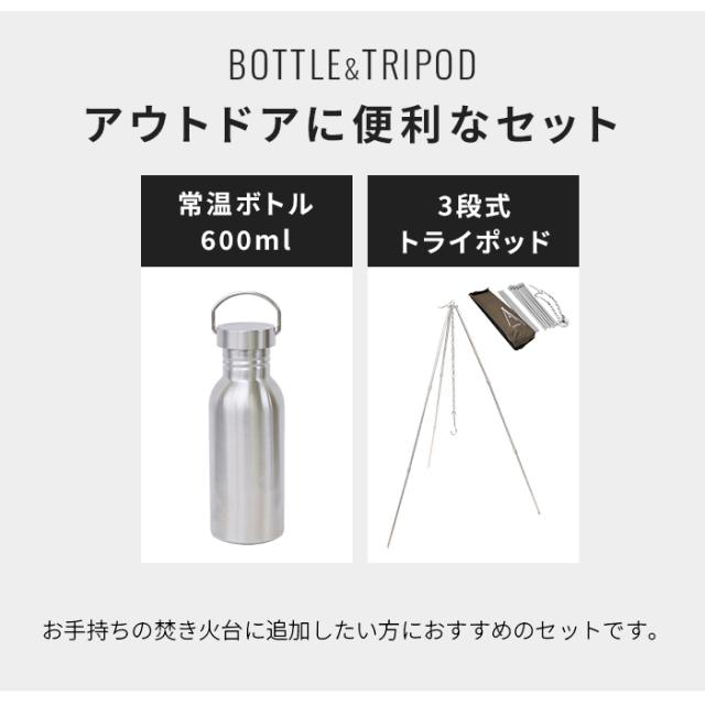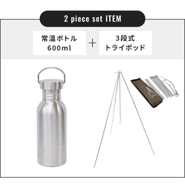 トライポッド ステンレスボトル 600ml 2点セット 直火OK 常温ボトル シングルウォール 吊り下げ コンパクト 軽量 ソロキャンプ ツーリング 湯沸かし キャンプギア 料理 アウトドア