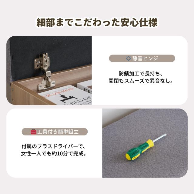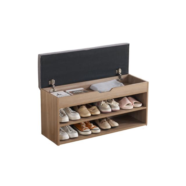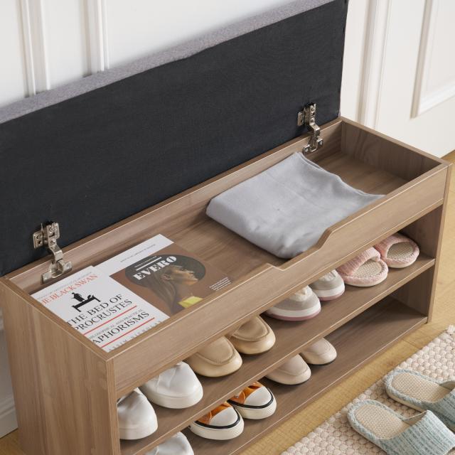 【収納デザイン】玄関ベンチのトップにあるクッション部分の下には開閉式の収納スペースがあり、靴ケア用品、傘などの小物を収納できます。収納機能をさらに拡張し、玄関の収納力を最大限に活用し、実用性を大幅に向上させます。